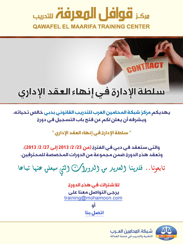الملف الصحفي » الأخبار تاريخياً » أخبار يوم 19/02/2013 » دورة : سلطة الإدارة في إنهاء العقد الإداري ـ بدء التسجيل للدورة »